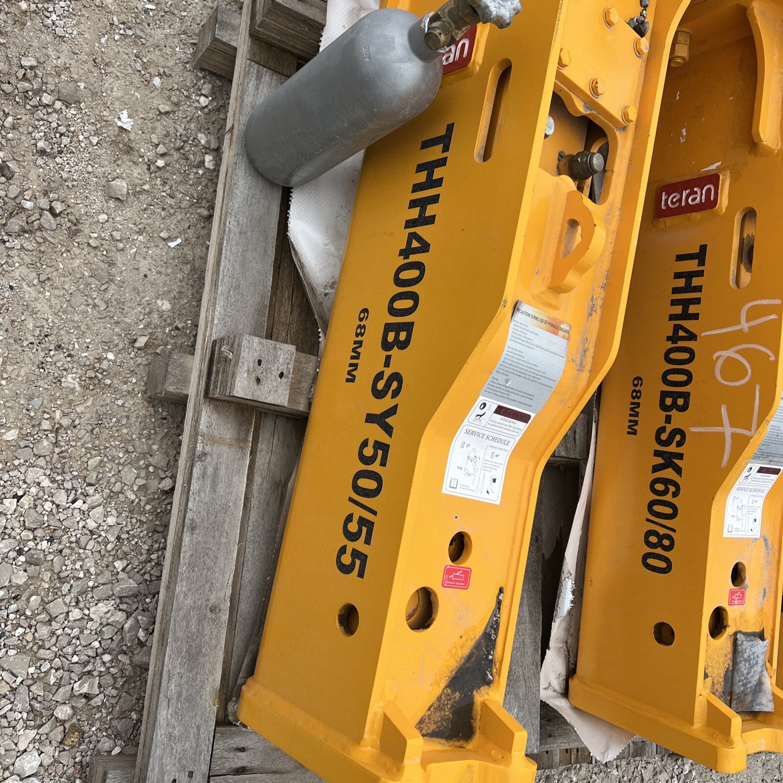 Sany SY50 SY55 Excavator Hammer 50 mm pins concrete breaker THH400B-SY50 new. 50 mm pins 6.75 inches between the mounting bracket ears 9.75 inches center to center of the pins Comes with 2 bits nitrogen charging kit Hoses Couplers Nitrogen tank Ships to a commercial address only or nearby shipping terminal