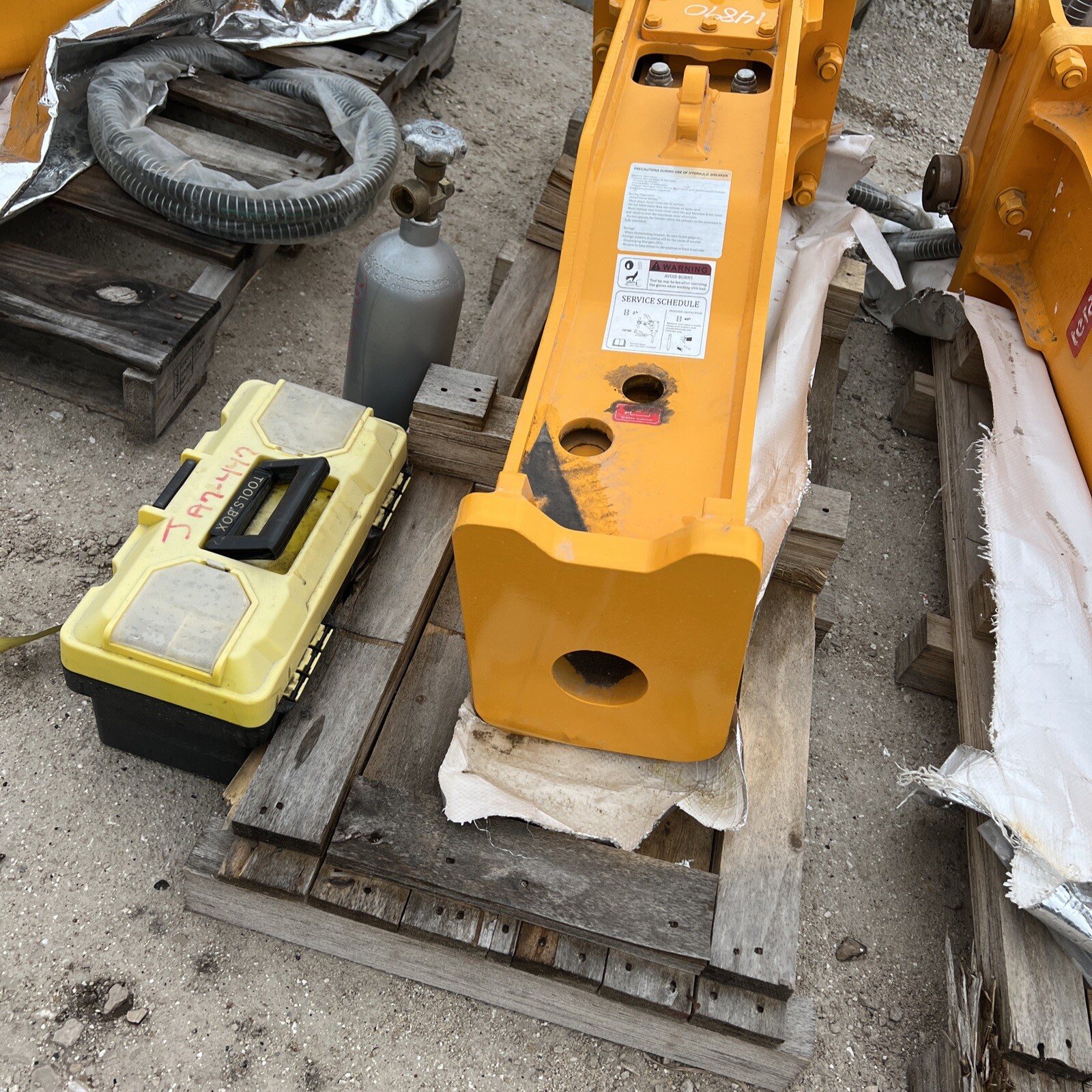 The package comes complete with 2 bits, a nitrogen charging kit, hoses, couplers, and a nitrogen tank. This comprehensive set provides everything needed to get the hammer operational right out of the box.