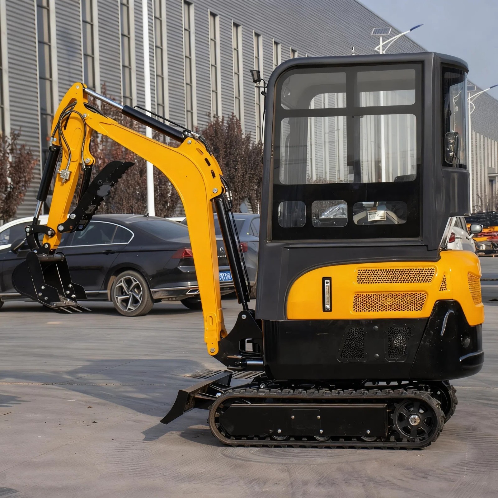 The excavator includes a protective driver's cab to shield operators from weather conditions and is designed with an inverted boom that protects the cylinder during demanding work. A free hydraulic extended thumb clip adds extra versatility for gripping and handling materials.